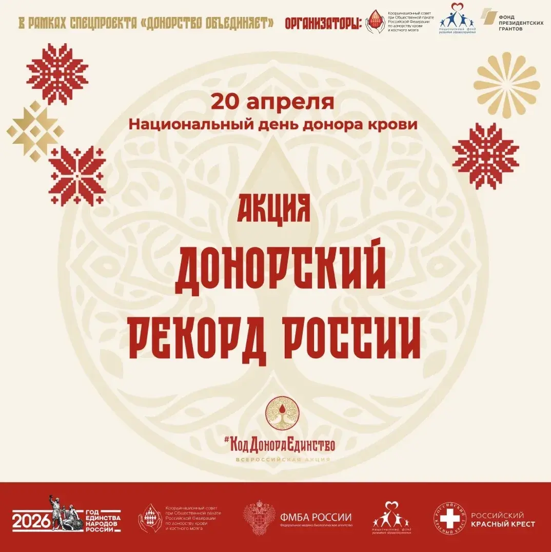 20 апреля, в Национальный день донора, в России стартует масштабная акция «Донорский рекорд России» в рамках спецпроекта «Донорство объединяет» Всероссийской акции «Код Донора Единство народов России». Ее цель – пополнить запасы донорской крови и показать, что донорство становится общим языком, который понимают все. Символично, что акция пройдет в знаковый день для всех доноров страны, а в Год единства народов России она приобретает особое значение. С ее помощью организаторы намерены подчеркнуть, что готовность помогать ближнему – ценность, объединяющая все народы нашей страны.